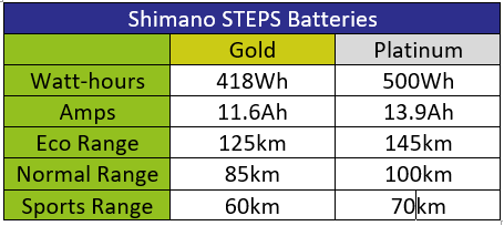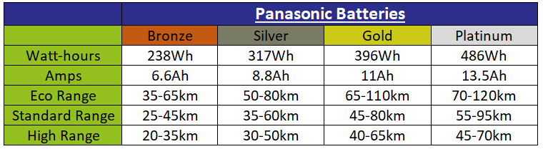 On acquiring a Gazelle hybrid bike with the Panasonic front-wheel motor you have a choice of four batteries (bronze, silver, gold and platinum) with different capacities and associated range.