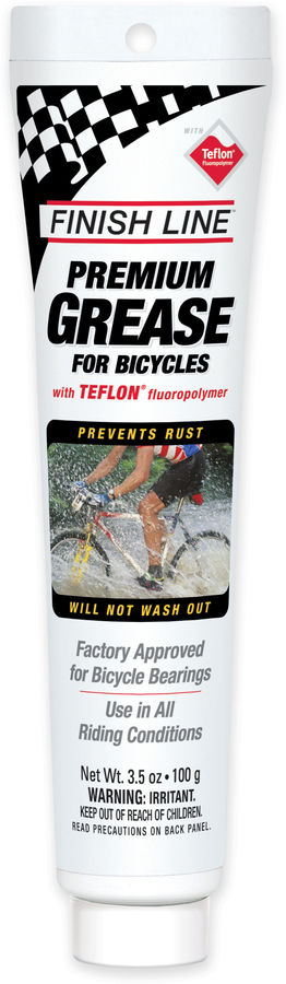 | Description | Finish Line grease is specifically formulated for use on bicycle bearings Super-slick Teflon-fortified formula coats and protects ball bearings and races, preventing wear and corrosion Works well in extremely stressful environments, such as in headsets and bottom brackets Great for other applications - hub bearings, pivots, etc Finish Line's exclusive hydrophobic grease thickening agent repels water and keeps grease stable even if totally submerged Grease will not separate or decompose under extreme heat The synthetic oils used are non-toxic and biodegradable, and the grease is non-toxic and environmentally friendly |