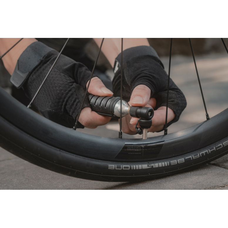 An extremely compact, lightweight and easy-to-use CO2 inflator. Precision CNC machined aluminum inflator fits Presta and Schrader valves and works with threaded 16g or 25g cartridges. Simply screw the cartridge in tight and then push the head onto the valve, unscrew the cartridge half a turn to release the CO2 cartridge.
