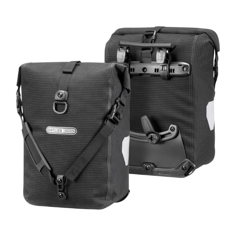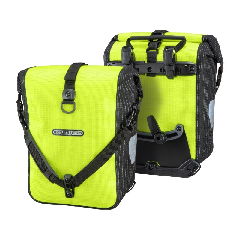 High visibility is so important to us at ORTLIEB because it is a matter of safety. Both the waterproof, polyurethane-coated Cordura fabric in neon yellow and the black fabric parts of this bag are densely interwoven with high-luminosity reflective yarn. This composition turns the entire bag into an eminently visible reflector when it is picked up in the headlights of passing cars.