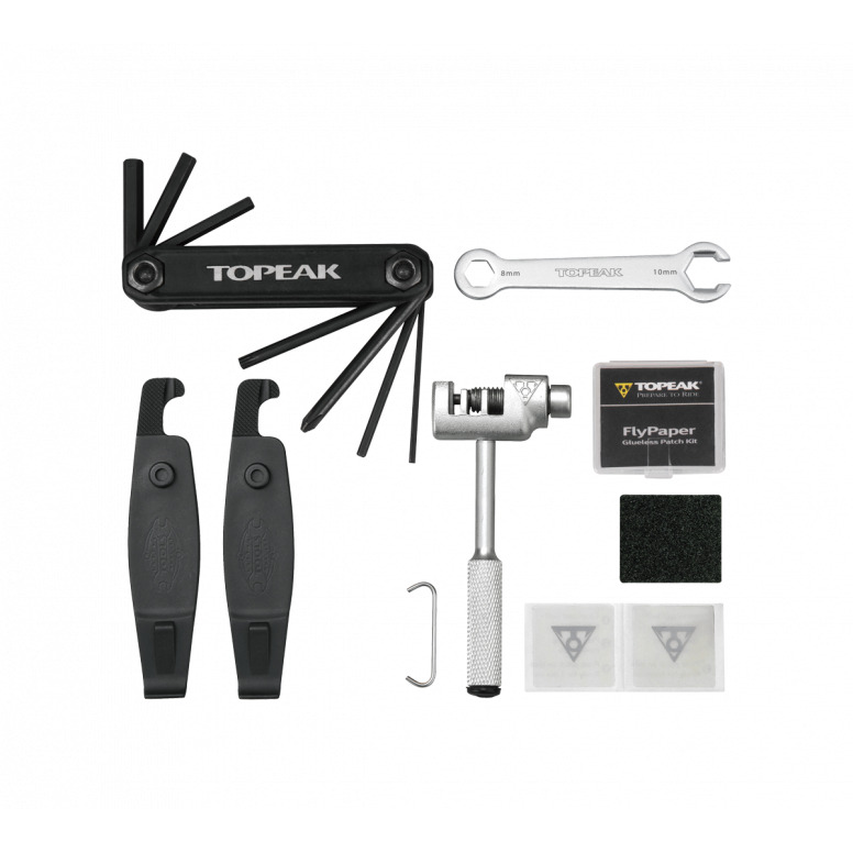 Large dual side opening moulded panels provide easy access to a complete 17 piece tool kit and all of your under saddle gear. 14 piece tool kit Includes 2, 3, 4, 5 & 6mm Allen wrenches, T25 Torx, Phillips screw driver, 8 & 10 mm open wrenches, universal chain tool with chain hook, 2 tire levers & a glueless patch kit. *The chain tool is compatible with single and multi-speed chains up to 12 speed, NOT including Campagnolo® 11 speed hollow pin chains.