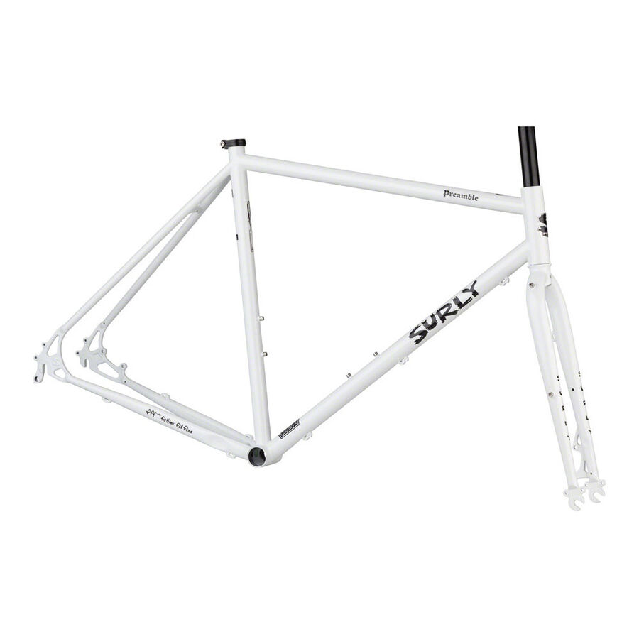| Description | Designed to introduce unfamiliar riders to Surly's pavement and gravel line, Preamble highlights Surly's most essential features: Durable custom steel tubing, a renowned ride feel, and just the right mounts for running racks, fenders, and bottle cages. Available in flat-bar and drop-bar configurations, it's disc-brake specific and shares a single-position vertical dropout with Surly Bridge Club. For new weekend riders and veteran commuters, Preamble makes it easier than ever to get out of the car and on top of tough and comfortable Chromoly steel. 100% Surly Chromoly steel frame and fork; double-butted main triangle |