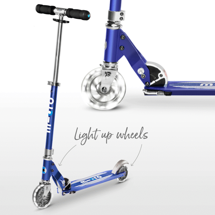 Description Our best selling 2 wheeled scooter now comes with LED light up front and back wheels. Our smart LED tech uses induction energy to turn the power kids create as they scoot into bright white light. No batteries. No fuss. Just a glow to light up the darkest evenings and brighten up the most ordinary days. Steers like a bike, rides like a dream. Our agile Sprite puts smiles on faces as children enter the world of two-wheel scooting. Whether building up speed or negotiating obstacles, kids can do it with ease thanks to the Sprite's intelligent design. With adjustable handlebars for years of scooting fun. Lightweight aluminium frame for the ultimate agility. Perfectly sized footplate that's neither too big nor too small. Simple, secure fold and handy kickstand for on-the-go convenience. We think there is no better first taste of life on two wheels.