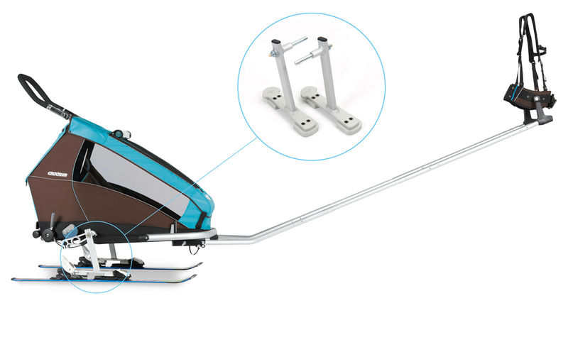 Description The ski adapter kit is designed to allow you to go skiing and snow hiking with the entire family. The adapter foot of the Croozer skiing kit inserts into any common children's downhill ski. You can also go snow hiking when you use the ski adapters in conjunction with the Croozer stroller wheel. The kit includes two adapters, the poles and an adjustable harness system which is extremely comfortable.